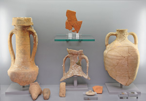 Los envases de almacenaje y transporte (ánfora) y las monedas son, junto con las vajillas de mesa, los objetos de los que obtenemos más información sobre el comercio, pues permiten conocer su lugar de fabricación y su uso. La gran mayoría de las ánforas venían cargadas con vino del sur peninsular; uno de los muchos barcos que lo transportaban se hundió en Cabo de Mar (Vigo) y dejó su carga diseminada por el fondo de la ría. Estos envases se podían marcar para identificar el taller y también para el control de la mercancía. En la vitrina se muestran algunos ejemplos de ánforas con marcas de los dos tipos y una de las tapas utilizadas para cerrar los envases. Se expone también un ejemplar de las primeras ánforas que llegan a Vigo, procedentes de Italia, y una de las últimas, de procedencia oriental.
